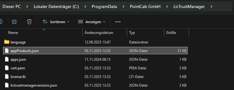 - Kann der LicTrustManager eine Internetverbindung herstellen? Im Dateipfad %programdata%/PointCab GmbH/LicTrustManager im Explorer die Datei “appProducts.json” löschen und ob dies nach dem Neustart von Origins erneut heruntergeladen wird.