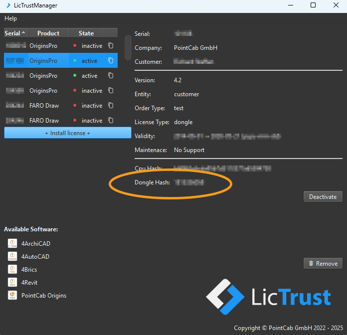 - If you are using a dongle, make sure that the “Dongle Hash” is displayed in the LicTrustManager application.
