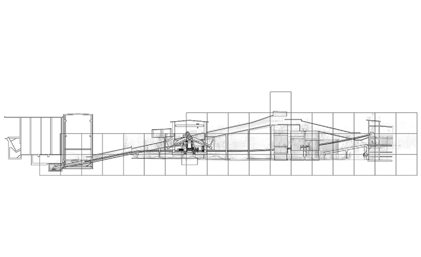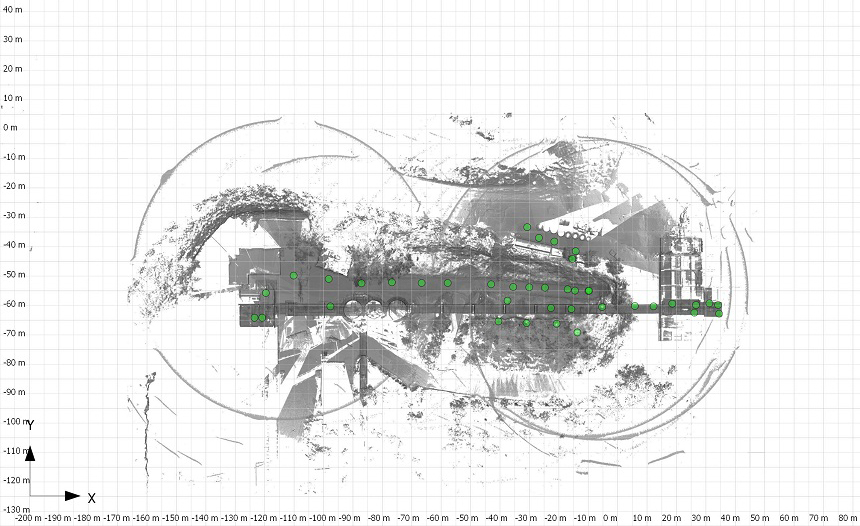 A FARO laser scanner was used to capture a conveyor belt system approximately 160 m in length, starting underground and ending at a discharge point about six metres above ground level. The conveyor passes through several silos and multiple height levels, making conventional measurement methods inefficient and time-consuming.